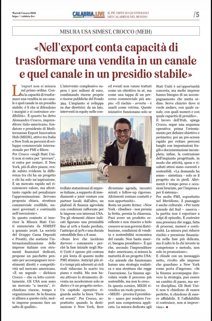 MISURA USA SIMEST: CROCCO (MEIH), «NON BASTA ESSERCI. SERVE FINANZA COERENTE CON LA STRATEGIA» 2 Marzo 2026 by Redazione